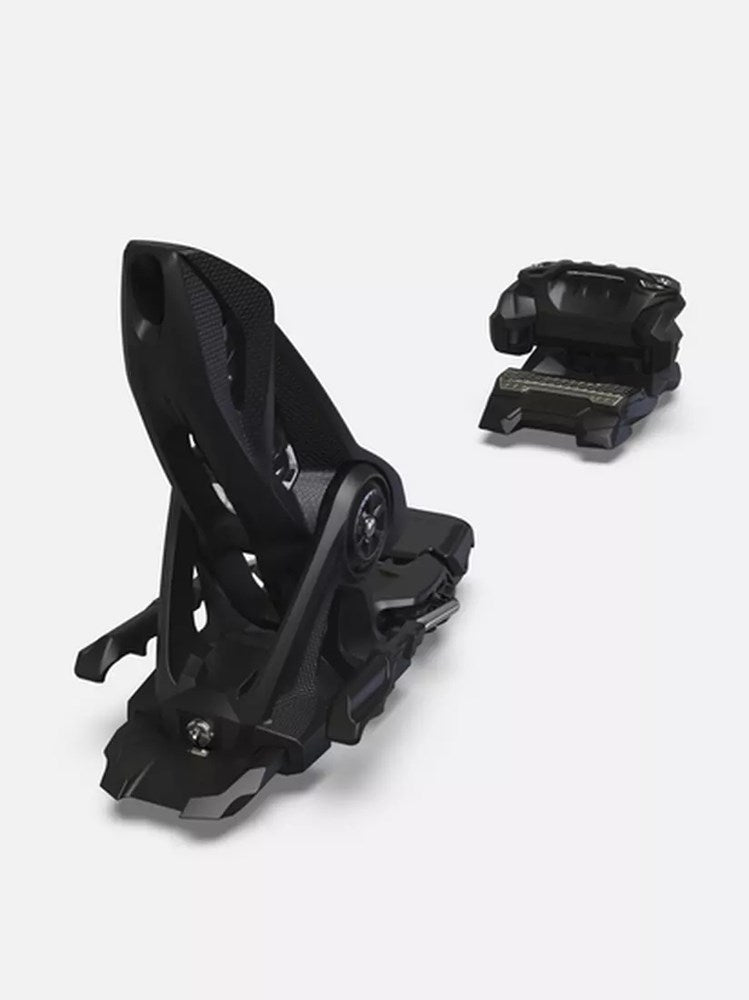 The toe construction with DIN/ISO up to Z 18 allows for impressive retention when freeriding. The spring in the toe is inserted horizontally and with a sole plate inclined by 5° it provides the higher energy absorption so as to reduce the risk of early release. The large supporting surface optimizes the power transmission and allows for great stresses and strains. In relation to their weight, toes with this technology therefore achieve a never-seen-before performance.